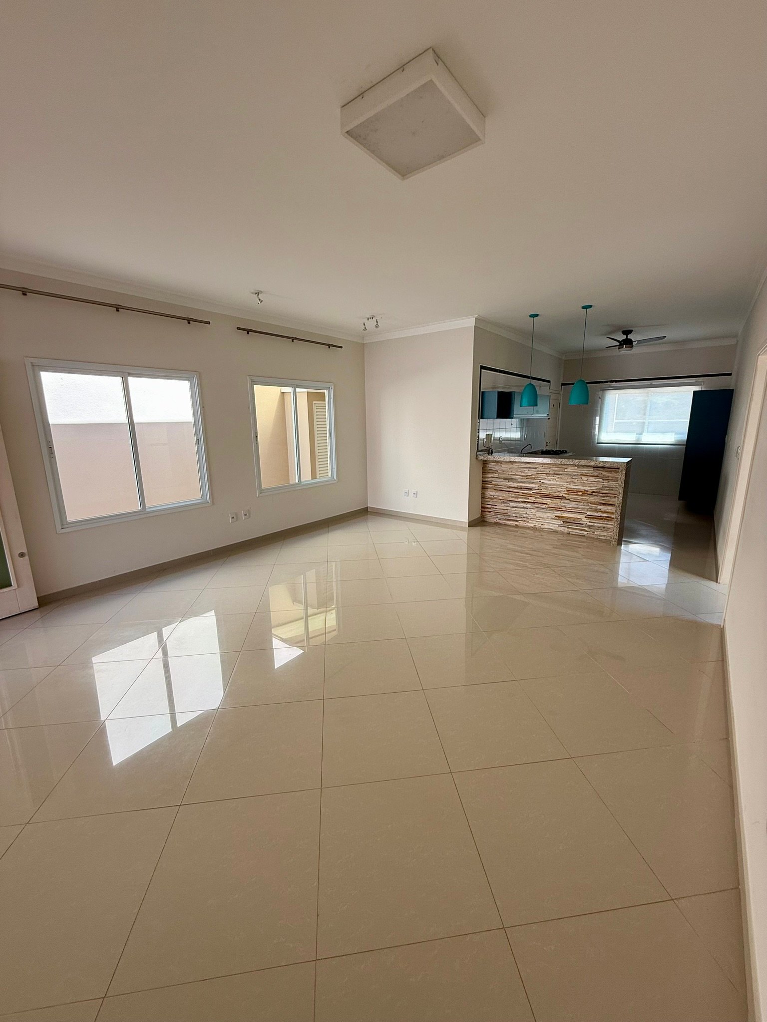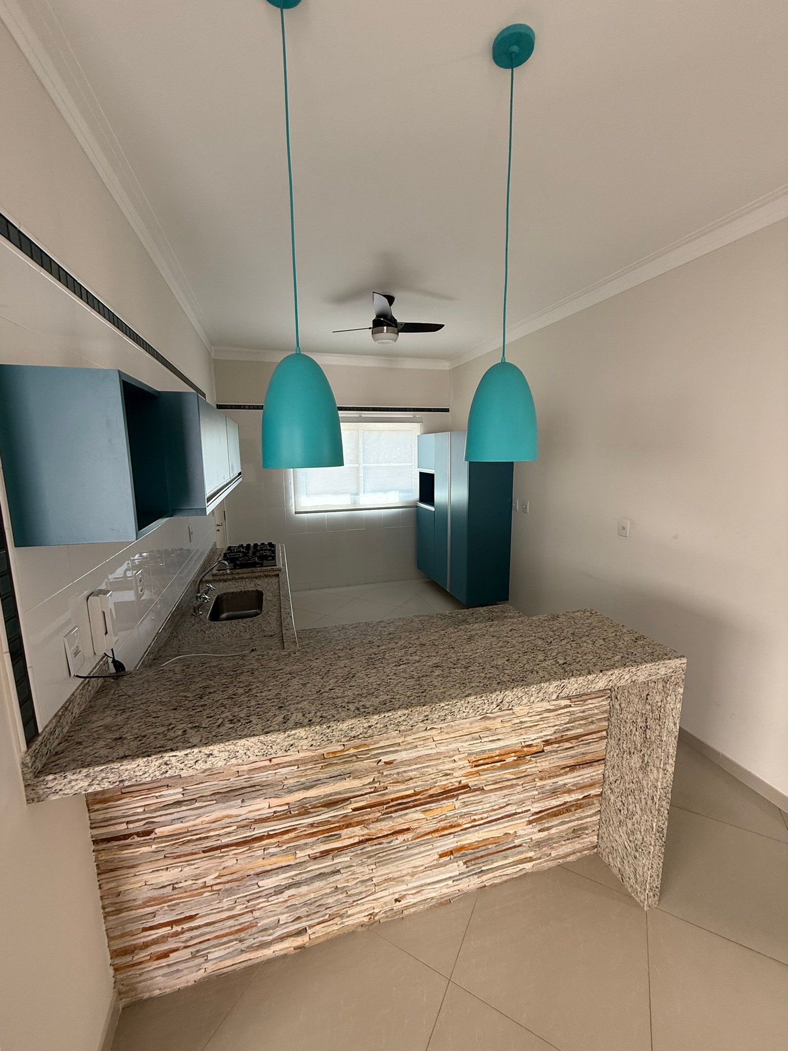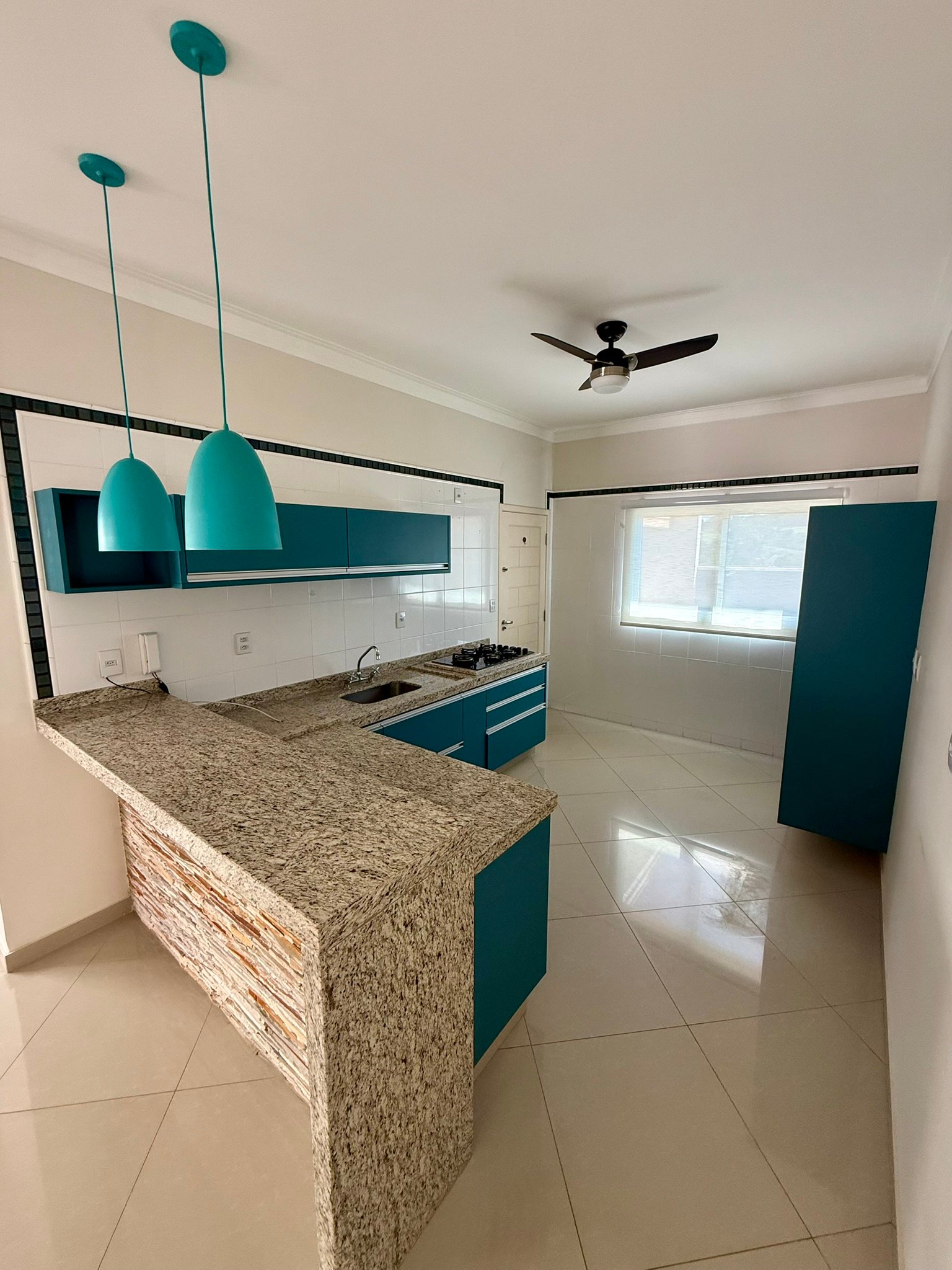 A área social é integrada, reunindo sala de estar, jantar e TV em um ambiente acolhedor e funcional, perfeito para a convivência familiar. A cozinha, também equipada com armários, conta com um moderno balcão americano, proporcionando praticidade e interação nos momentos do dia a dia.
