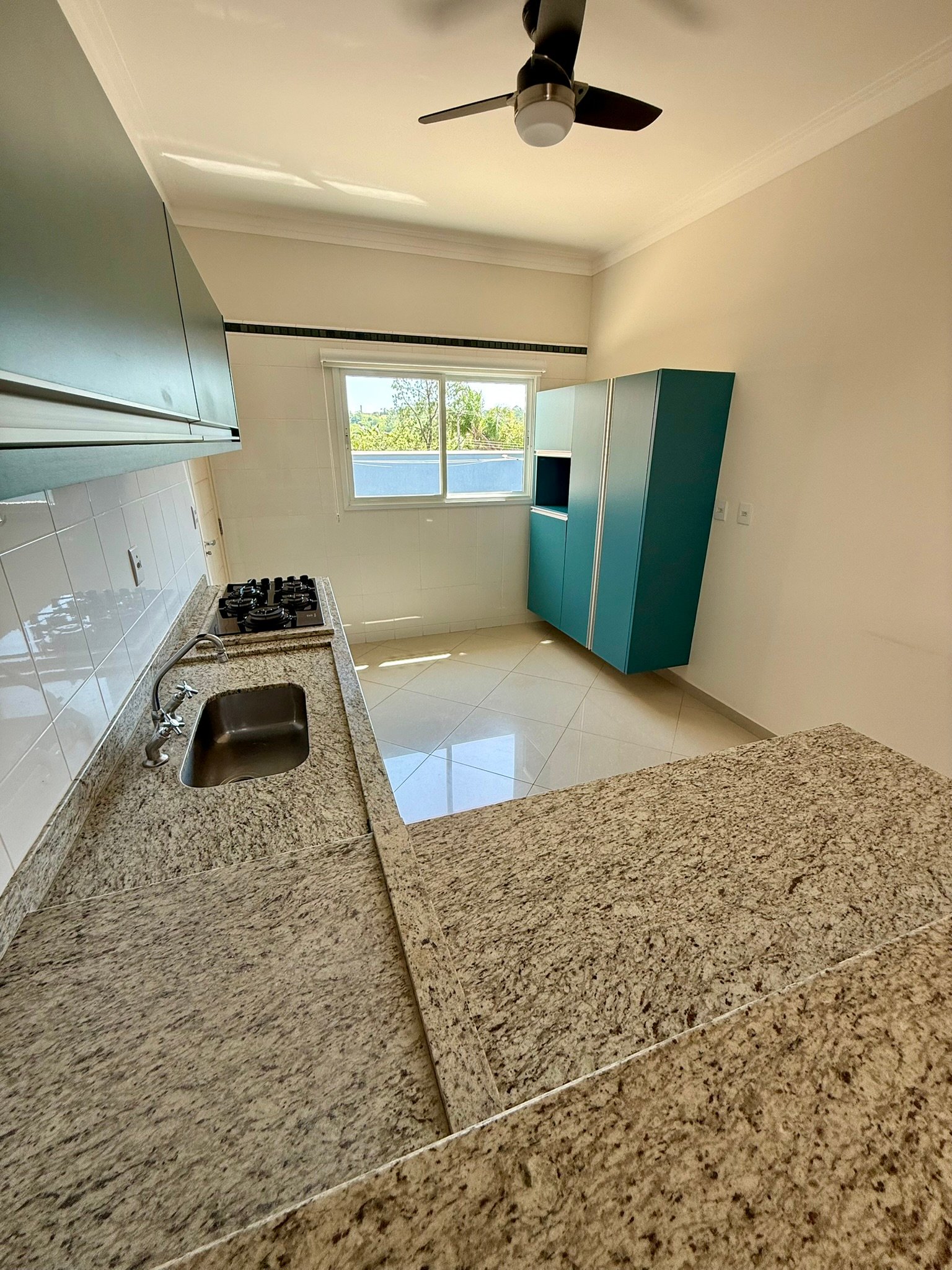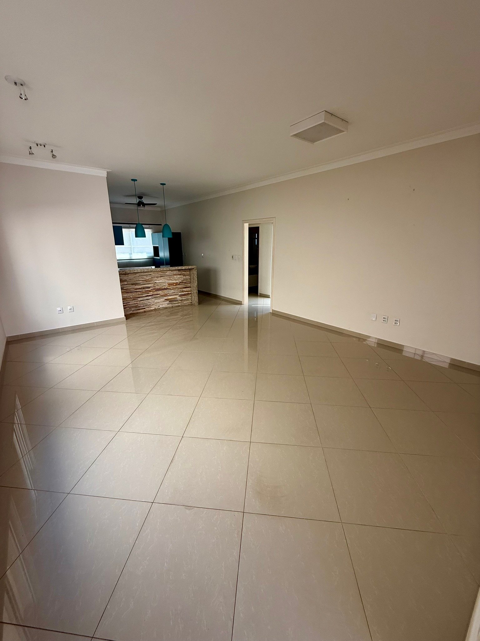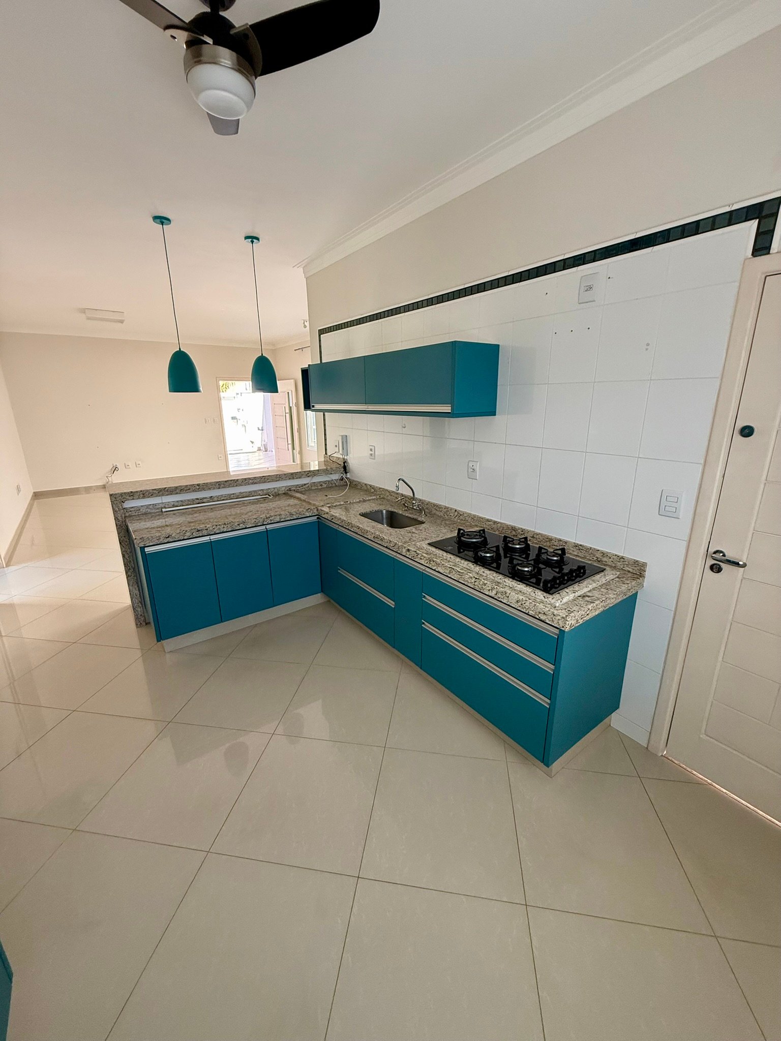 A área social é integrada, reunindo sala de estar, jantar e TV em um ambiente acolhedor e funcional, perfeito para a convivência familiar. A cozinha, também equipada com armários, conta com um moderno balcão americano, proporcionando praticidade e interação nos momentos do dia a dia.